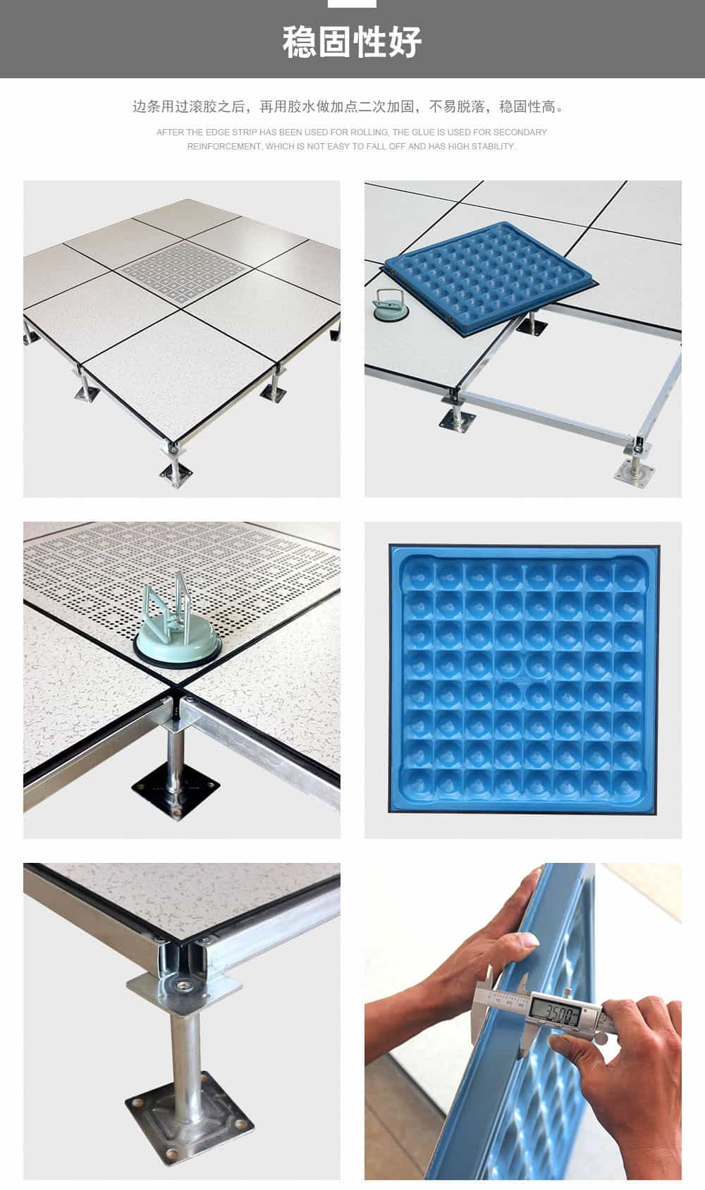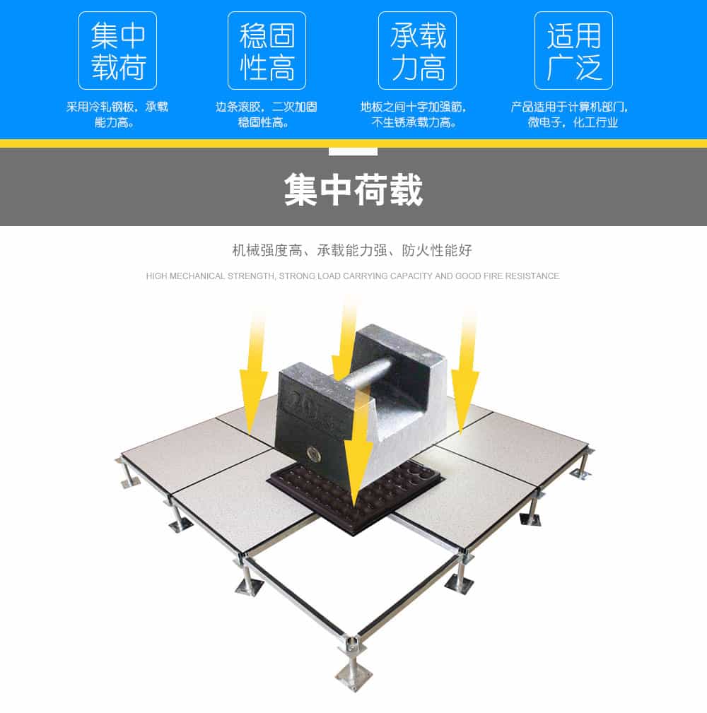全鋼防靜電地板為全鋼組件,分有邊、無邊、微邊(三種邊處理方式)。底面采用SPCC深沖冷軋板拉伸成型鋼板厚度(0.4~1.5mm),球窩狀結(jié)構(gòu),增加地板的機械荷載強度。面板采用硬質(zhì)SPCC鋼板(0.5~2.0mm),上下經(jīng)過點焊焊接成型,切邊沖孔后,經(jīng)防銹處理,環(huán)氧樹脂粉末靜電噴涂后,中間填充發(fā)泡水泥(可以根據(jù)客戶需求發(fā)泡不同重量),再經(jīng)過日曬養(yǎng)護后形成穩(wěn)定的承載結(jié)構(gòu)。地板上表層粘貼防火板(HPL)/復合PVC/ 通體PVC/陶瓷地磚等不同材質(zhì)的裝飾表層,達到產(chǎn)品花色的多樣性、可以根據(jù)客戶需求個性化定制產(chǎn)品。搭配聯(lián)網(wǎng)支架、支架、螺釘組裝后,定位聯(lián)接更加準確、精度可靠。